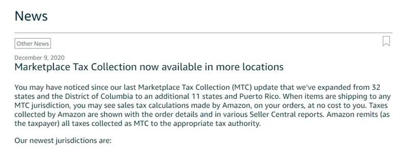 近日,亞馬遜美國發布了關于更多地區商城收稅的公告,新增了11個亞馬遜需要代收代繳銷售稅的地區。