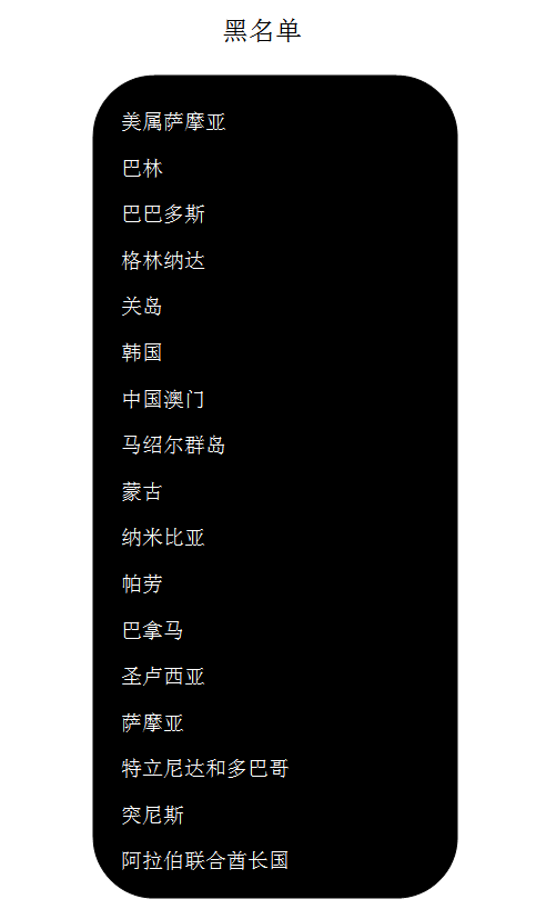 不合規(guī)的地區(qū)或國(guó)家被列入黑名單或顯示為灰色。第一份名單于2017年12月5日發(fā)布,當(dāng)時(shí)有17個(gè)國(guó)家和地區(qū)被列入黑名單。具體包括的國(guó)家和地區(qū)如下圖所示,馬歇爾赫然在列。